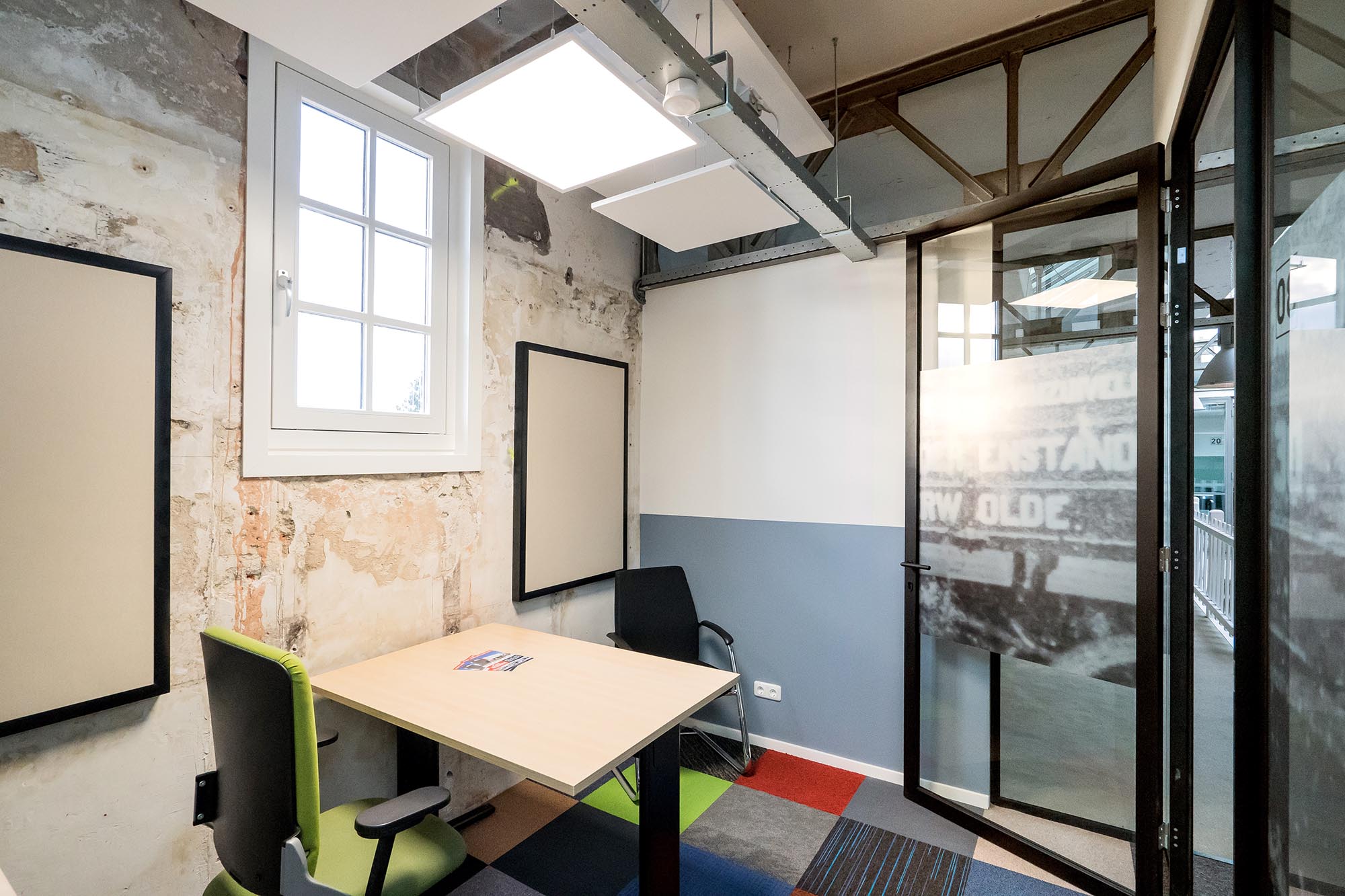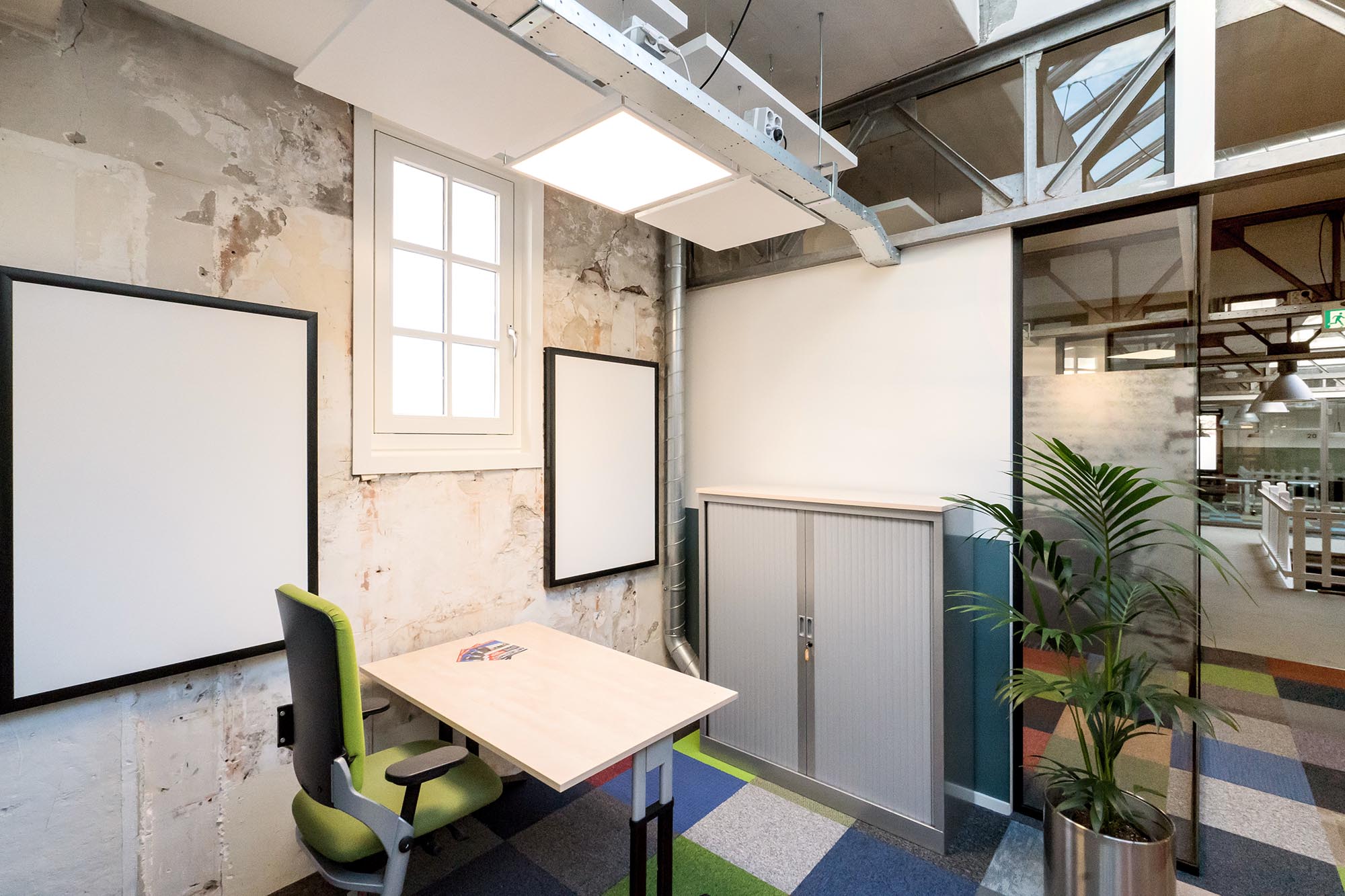 Op de 1e verdieping van d’Olde Melkfabriek bevindt zich deze moderne glazen kantoorruimte met een industriële look. De glaswanden zijn voorzien van foto-folie met beelden van de Boerenstand, de oude boter- en melkfabriek uit begin 20e eeuw. Deze kantoorruimte is ingericht voor één werkplek. Het contrast tussen de oude muren en spanten met de moderne wanden, verlichting en verwarming zorgen voor een unieke werkomgeving.